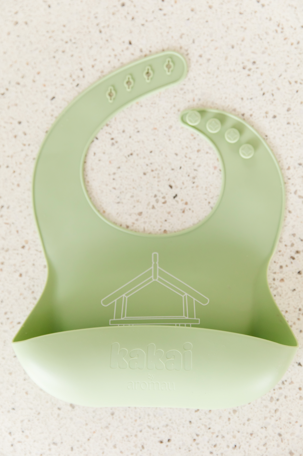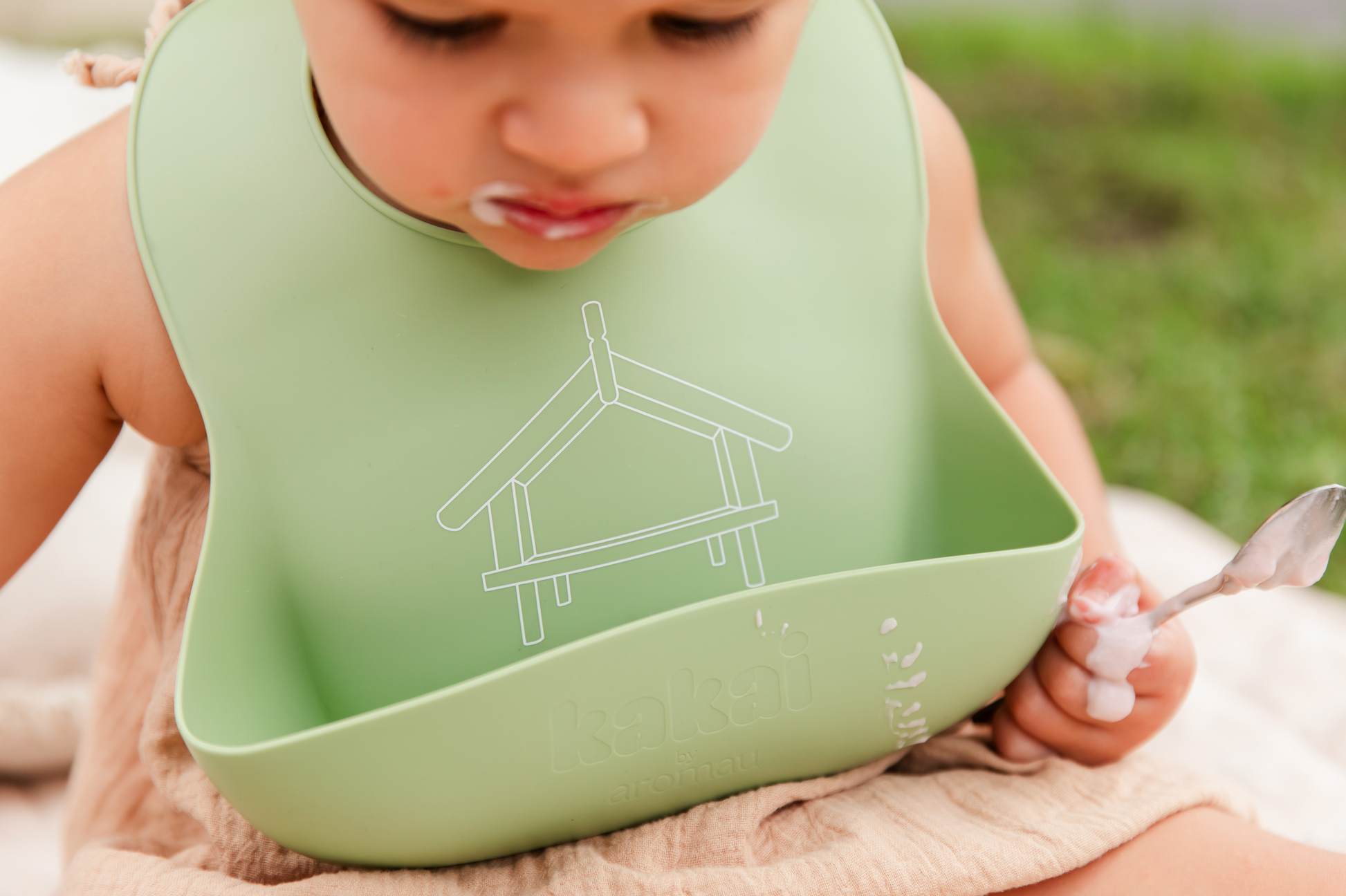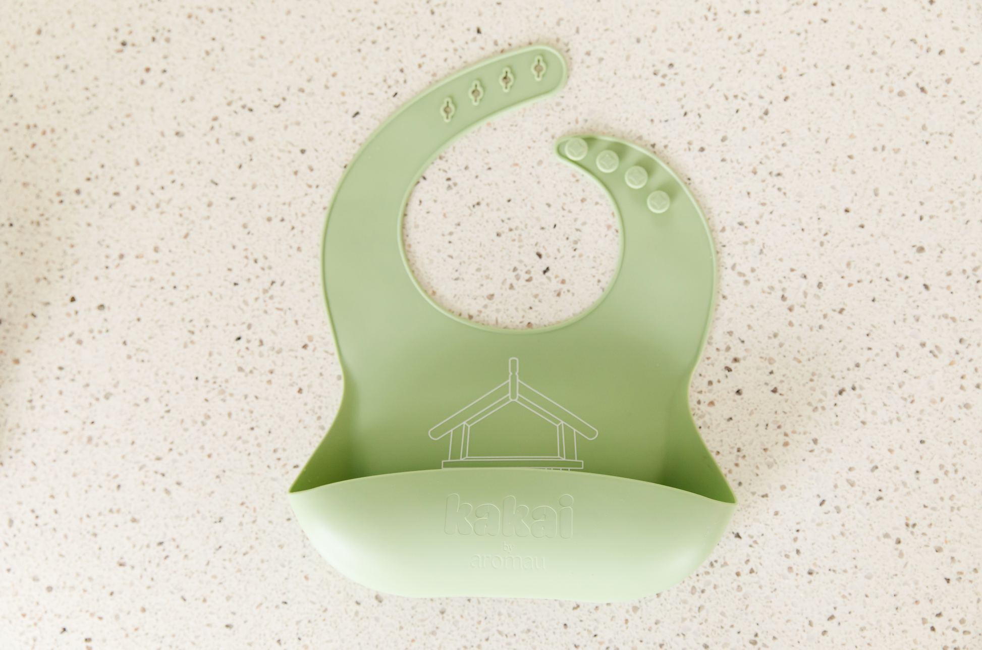 Our soft, durable silicone bibs are designed with a meaningful pātaka kai print, grounding whānau in traditional tikanga and the Māori values around kai.